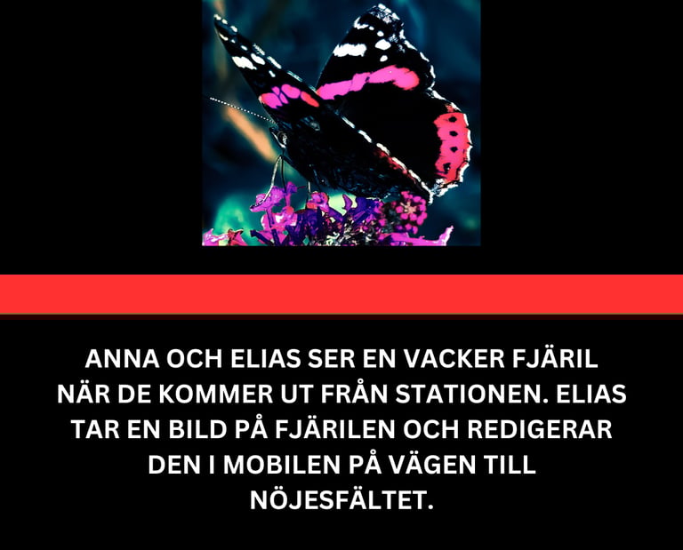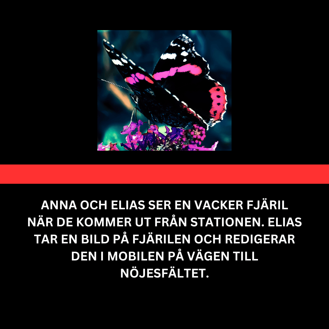 Elias: Anna. Det var en häftig upplevelse att åka berg- och dalbanan. Det får vi göra om nästa gång vi är på nöjesfältet. Det plingade till i din telefon under åkturen. Var det något viktigt?