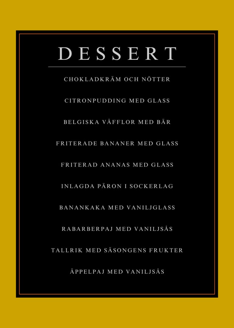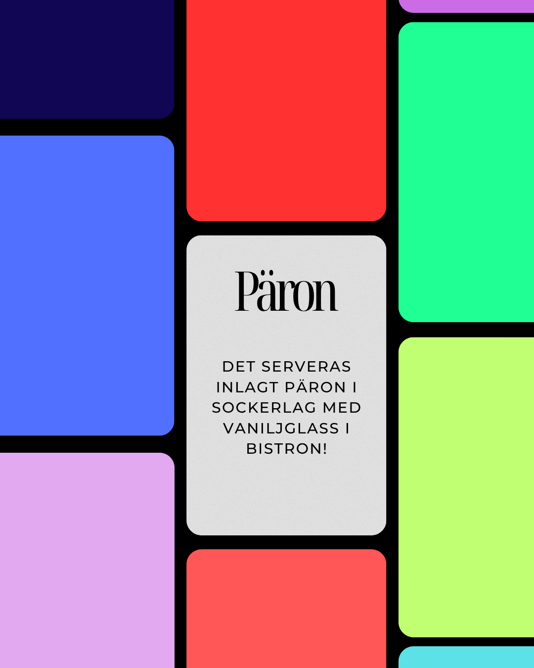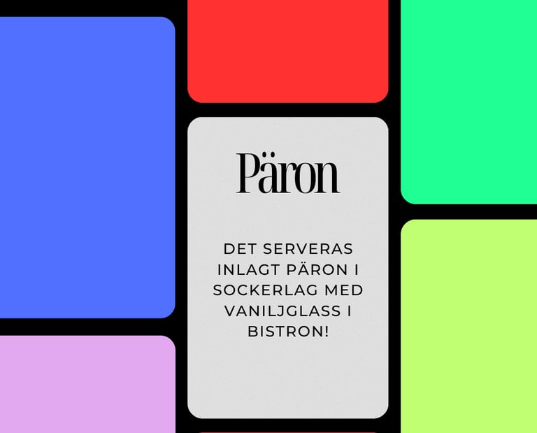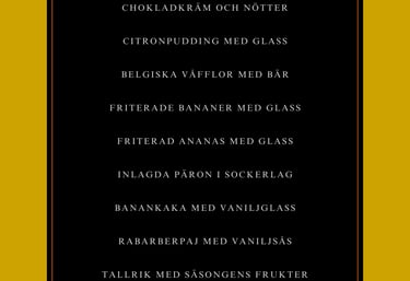 Konduktören: Välkommen ombord på tåget. Hoppas ni som kommer från nöjesfältet haft en trevlig upplevelse. Idag serveras det inlagt päron i sockerlag i bistron.