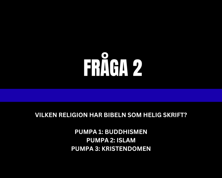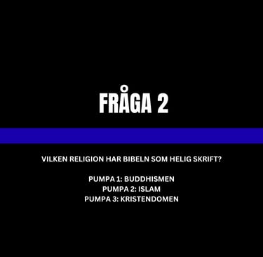 Kristen: Inom min religion är Protestantismen och Katolska kyrkan de två största riktningarna. Vår heliga skrift heter Bibeln. Bibeln består av det gamla testamentet och det nya testamentet.