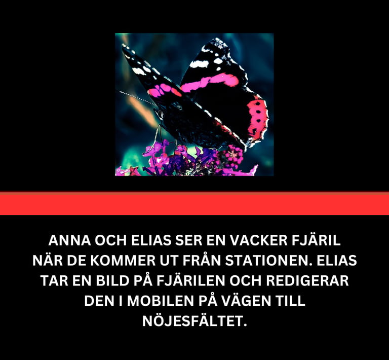 Elias: Anna. Det var en häftig upplevelse att åka berg- och dalbanan. Det får vi göra om nästa gång vi är på nöjesfältet. Det plingade till i din telefon under åkturen. Var det något viktigt?